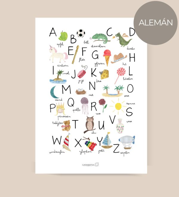 Lámina de acuarela original pintada a mano por Bea de Garabatea design. Forma parte de la serie infantil educativa compuesta por láminas de abecedarios en varios idiomas y la lámina de números. Si quieres, ¡puedes convertirla en un pack y llevarte ambas láminas a un precio más reducido!