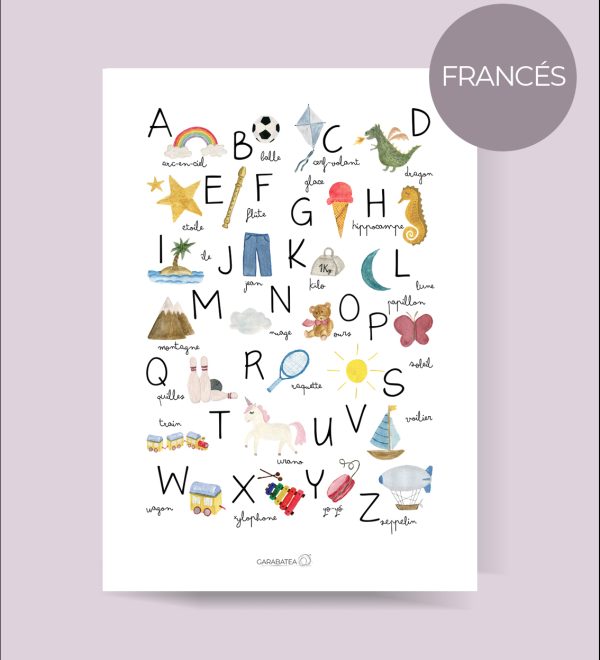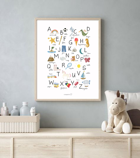 Lámina de acuarela original pintada a mano por Bea de Garabatea design. Forma parte de la serie infantil educativa compuesta por láminas de abecedarios en varios idiomas y la lámina de números. Si quieres, ¡puedes convertirla en un pack y llevarte ambas láminas a un precio más reducido!