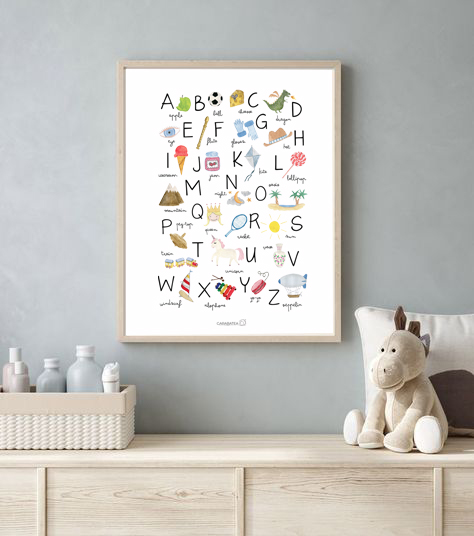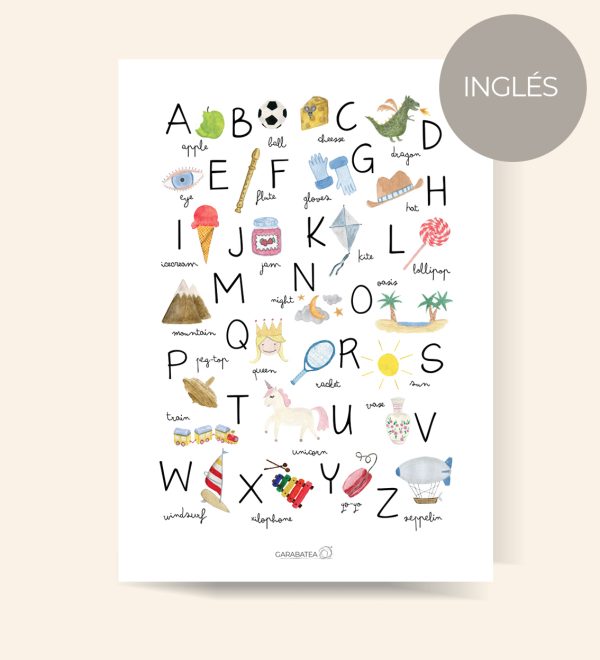 Lámina de acuarela original pintada a mano por Bea de Garabatea design. Forma parte de la serie infantil educativa compuesta por láminas de abecedarios en varios idiomas y la lámina de números. Si quieres, ¡puedes convertirla en un pack y llevarte ambas láminas a un precio más reducido!