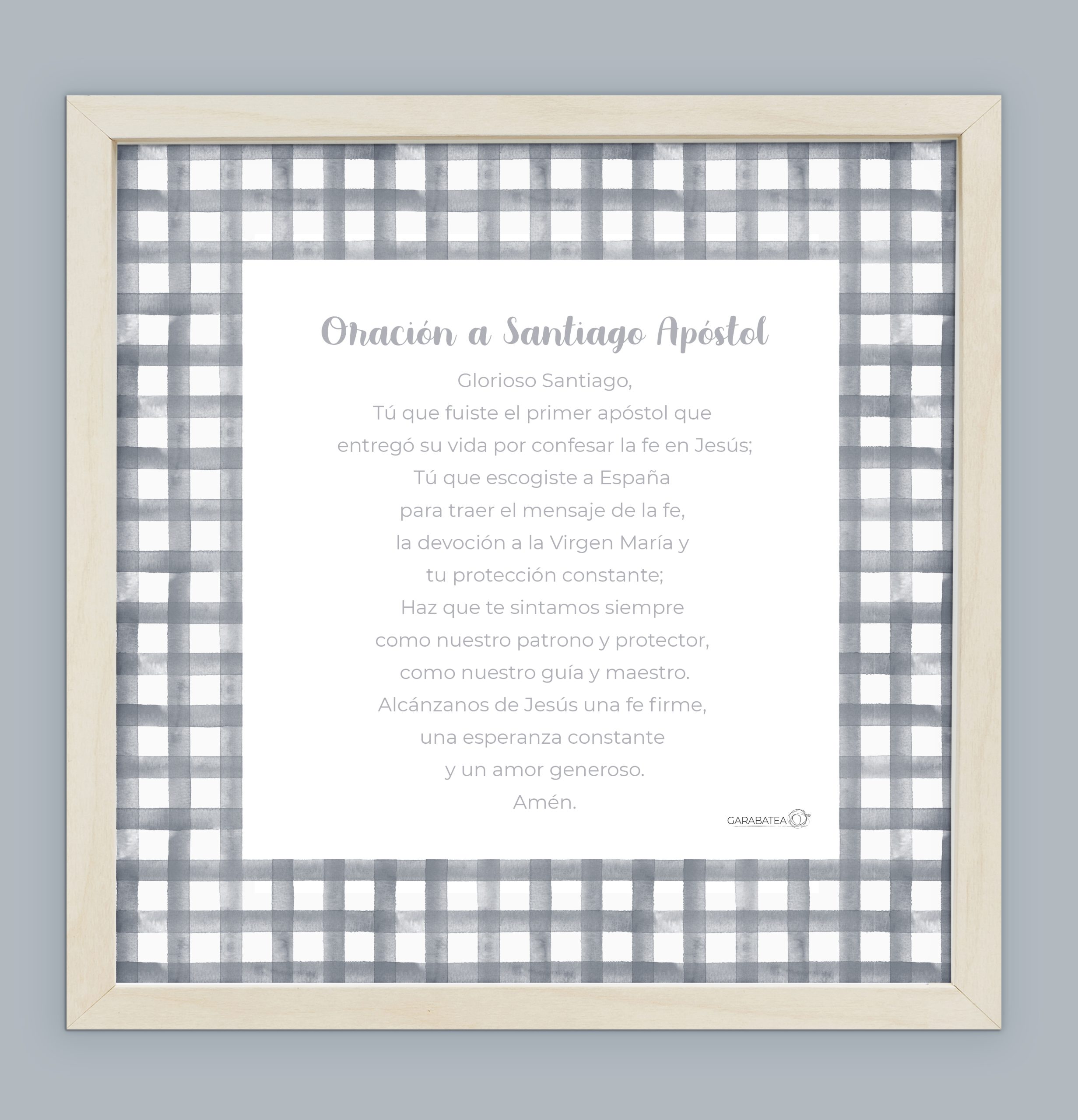 Esta lámina con la oración al apóstol Santiago hace pareja con la lámina de Santiago del mismo color, ambas decoradas alrededor con una franja de cuadros vichy, ideal para decorar una habitación infantil. Disponible en varios colores diferentes.