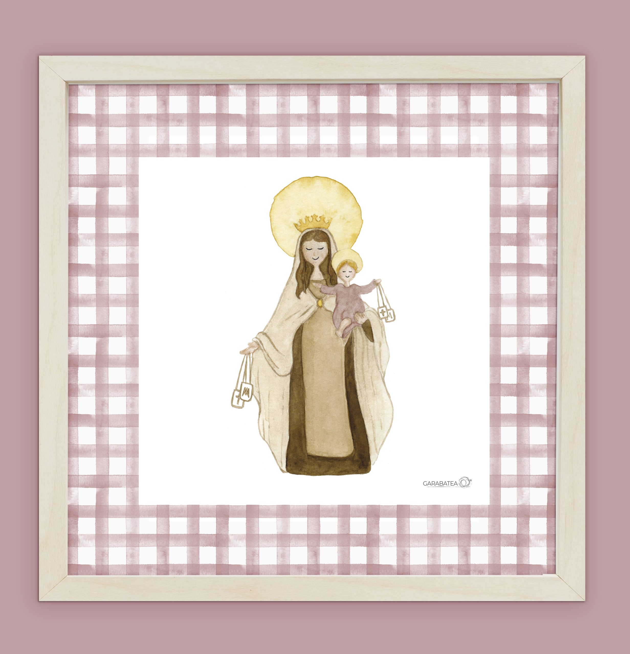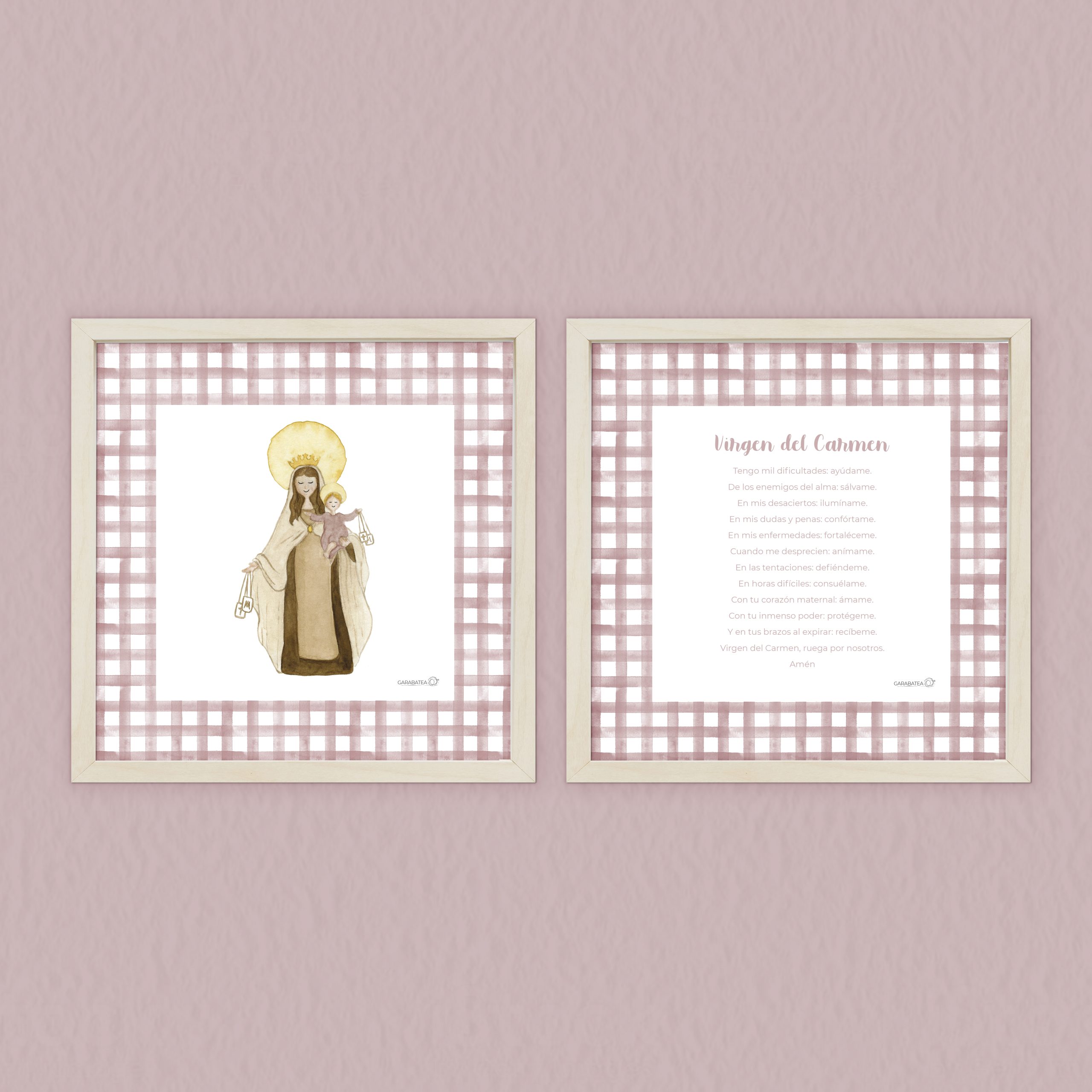 Esta lámina con nuestra virgencita del Carmen hace pareja con su oración del mismo color, ambas decoradas alrededor con una franja de cuadros vichy, ideal para decorar una habitación infantil. Disponible en varios colores diferentes.