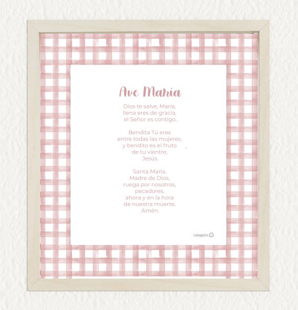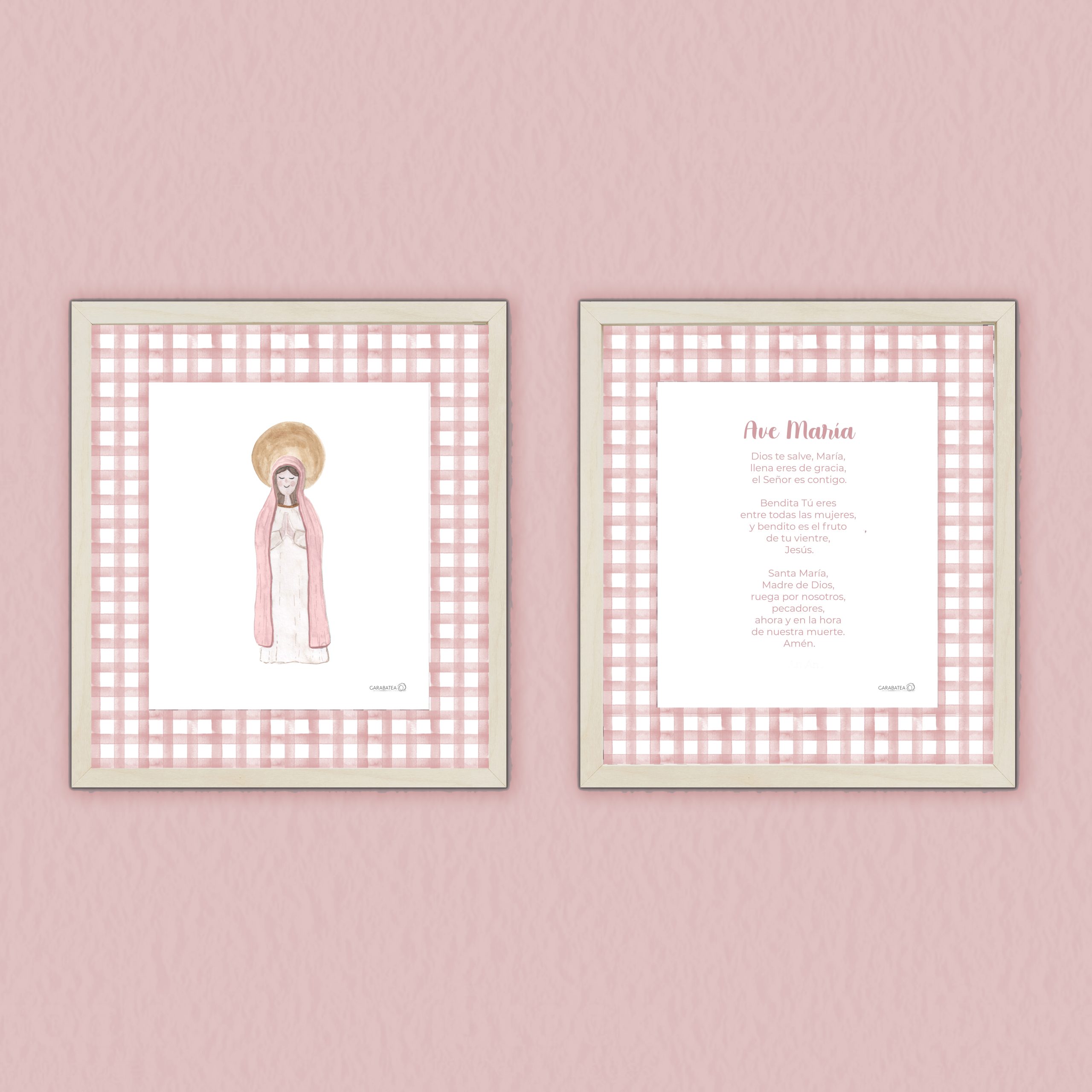 Esta lámina con la oración del Ave María hace pareja con la lámina de la virgencita del mismo color, ambas decoradas al rededor con una franja de cuadros vichy, ideal para decorar una habitación infantil. Disponible en varios colores diferentes.