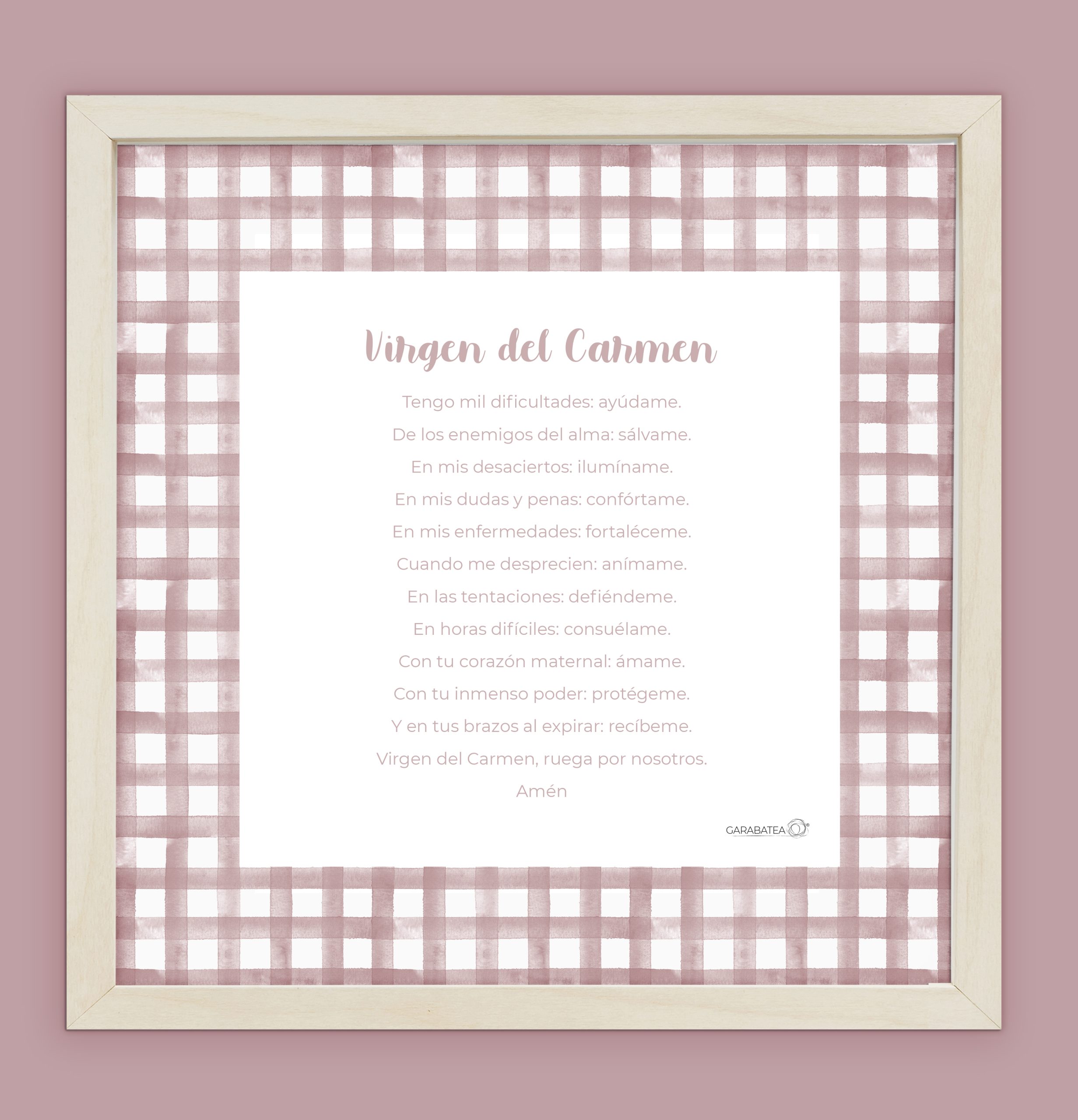 Esta lámina con la oración a la Virgen del Carmen hace pareja con la lámina de la virgencita del mismo color, ambas decoradas al rededor con una franja de cuadros vichy, ideal para decorar una habitación infantil. Disponible en varios colores diferentes.