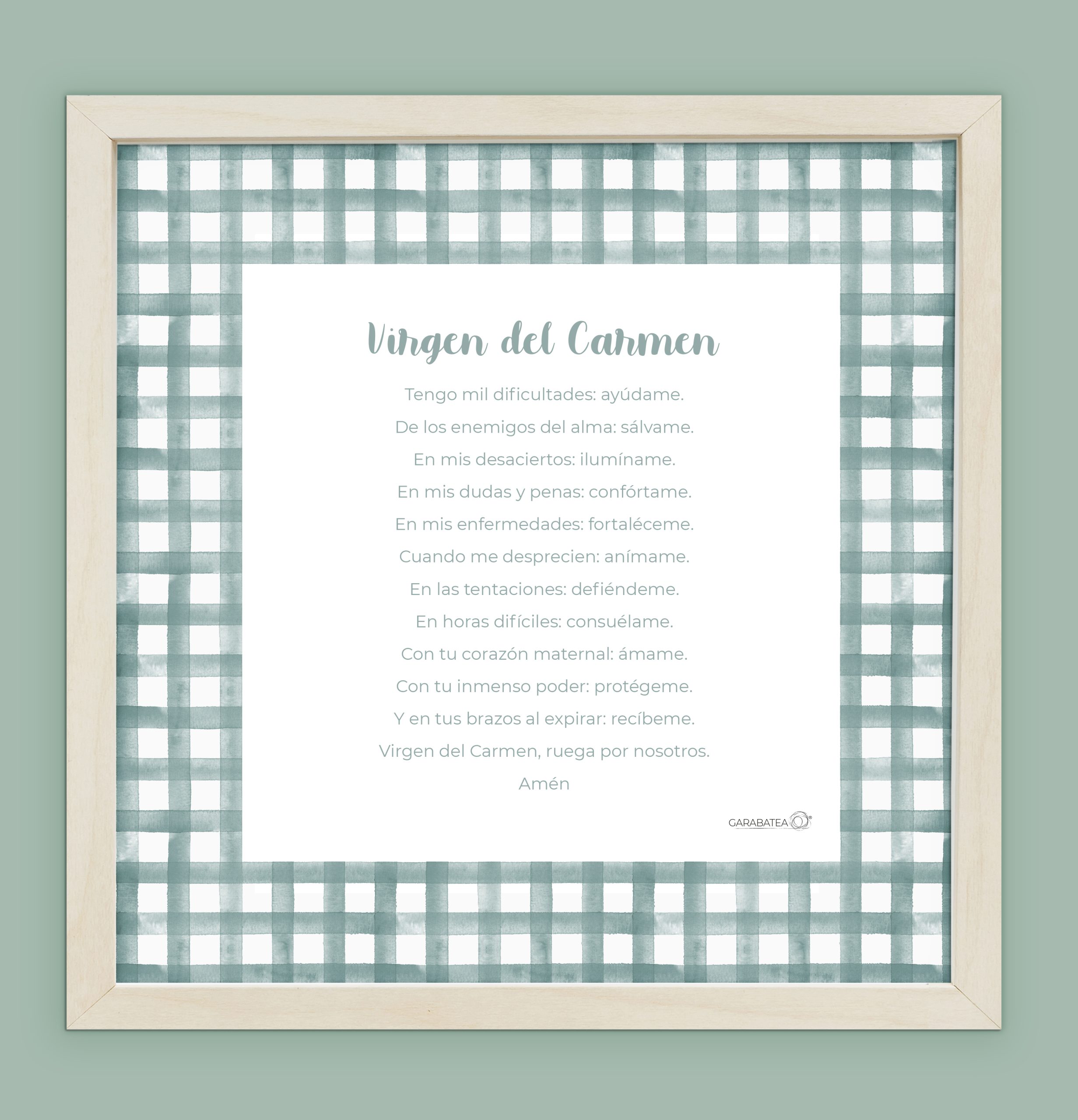 Esta lámina con la oración a la Virgen del Carmen hace pareja con la lámina de la virgencita del mismo color, ambas decoradas al rededor con una franja de cuadros vichy, ideal para decorar una habitación infantil. Disponible en varios colores diferentes.